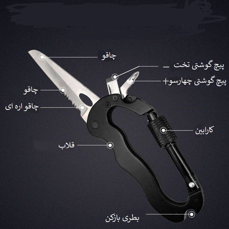 نوع چاقو :تاشو جنس دسته :فولاد تعداد ابزار :هشت تعداد عملکرد :هشت عدد طول بلندترین تیغه: 10 میلی متر نوع تیغه: فولادی نوع چاقو: تاشو