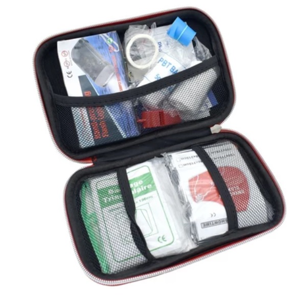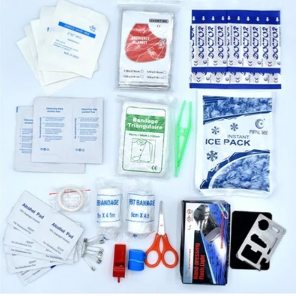 محتویات جعبه کمکهای اولیه: چسب زخم پنس گاز استریل شریان بند باند کشی باند زخم چسب باند پد الکلی سوت سنجاق قفلی بروشور آموزشی پتوی نجات دستمال سه گوش قیچی چسب حلقه ای چراغ قوه کمپرس یخ |