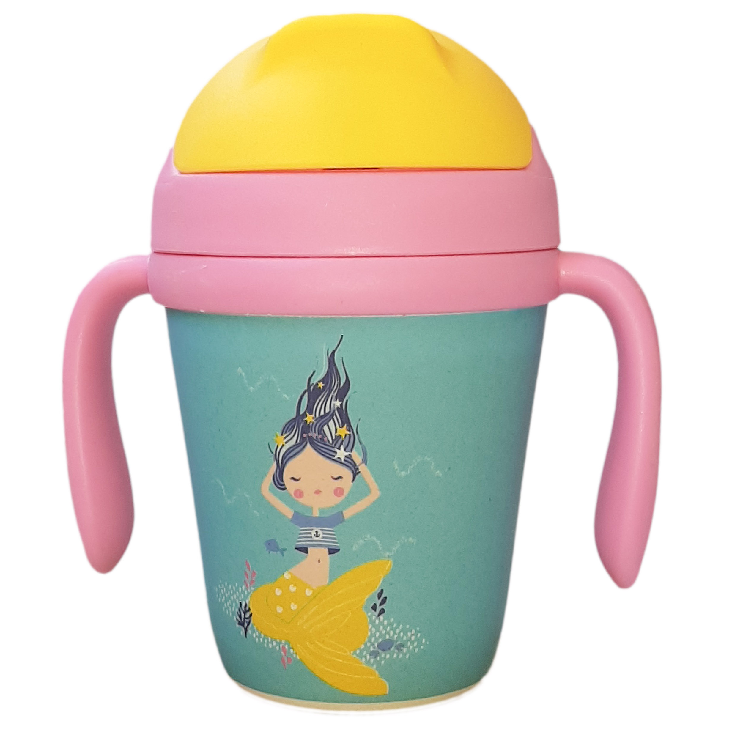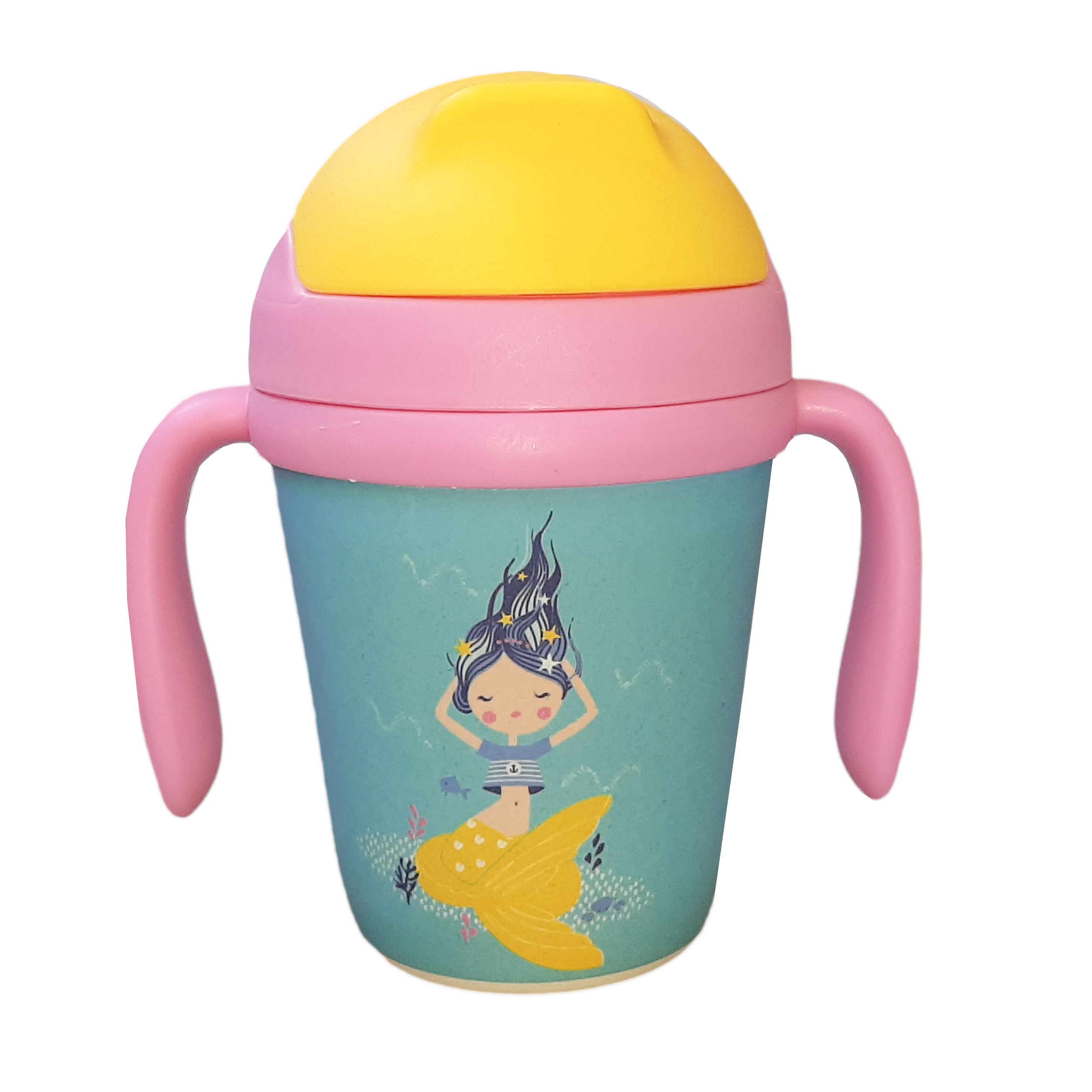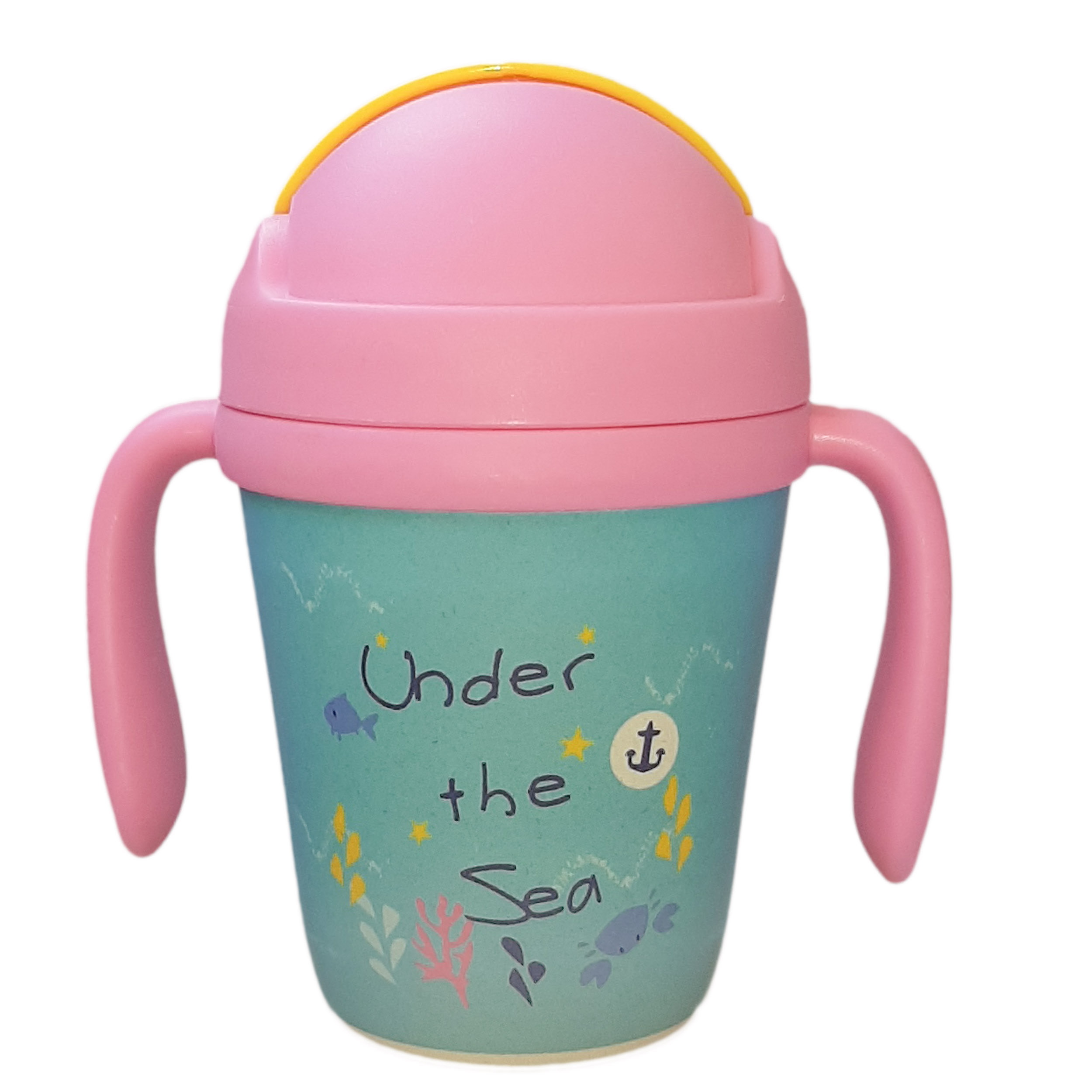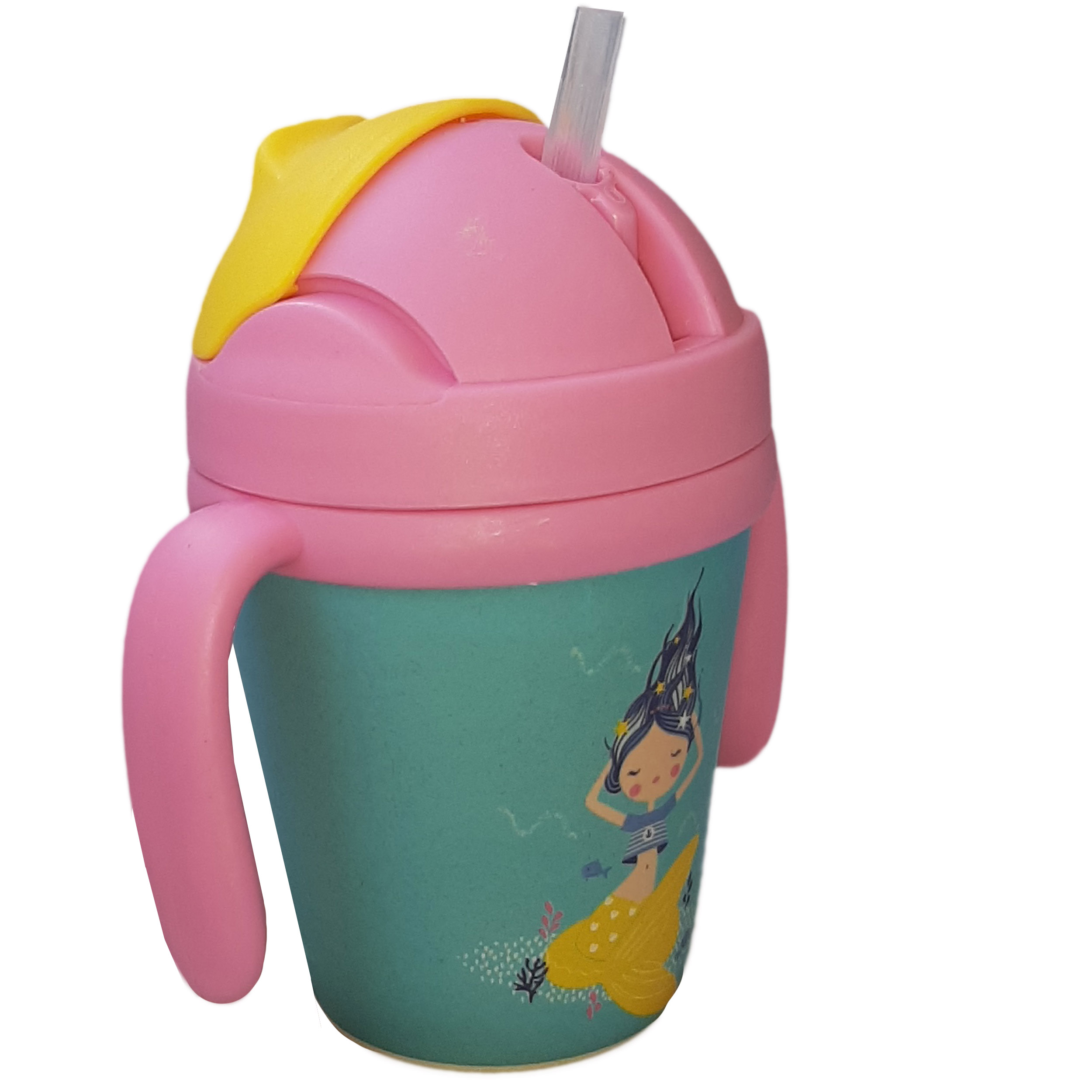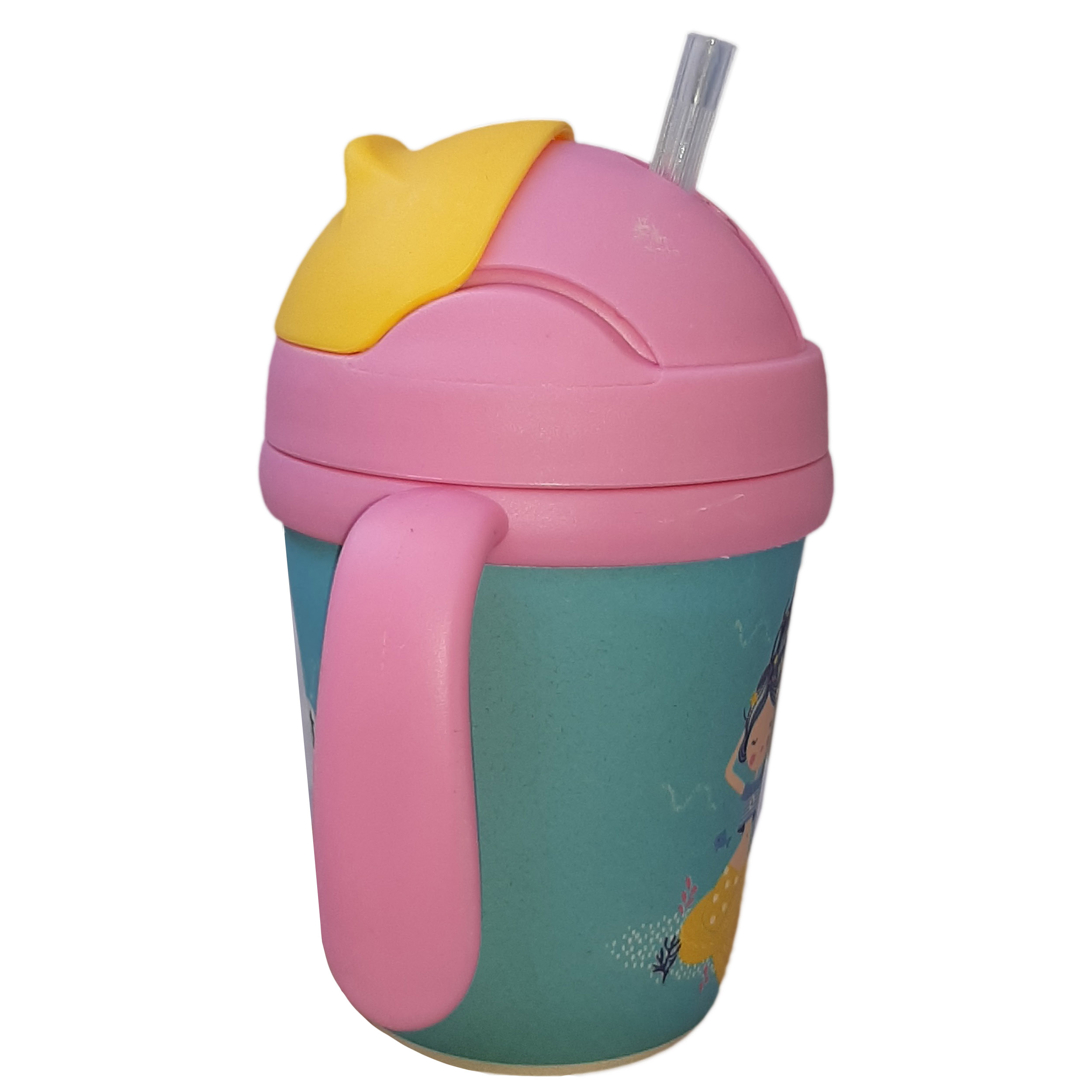لیوان نی دار تهیه شده از پلیمر گیاهی دارای درپوش دارای دو دسته جهت راحتی نوزاد