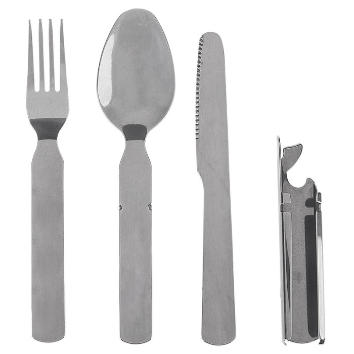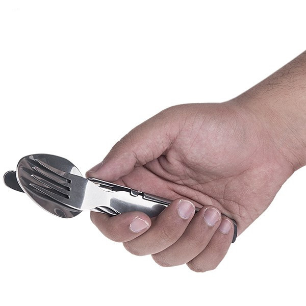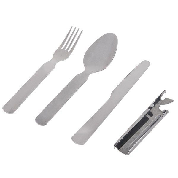 ابعاد: طول 17 سانتیمتر وزن: 143 گرم سایر توضیحات: - ساخته شده از استیل - دارای یک غلاف برای نگهداری - شامل یک قاشق، چنگال و چاقو - دارای در قوطی بازکن |