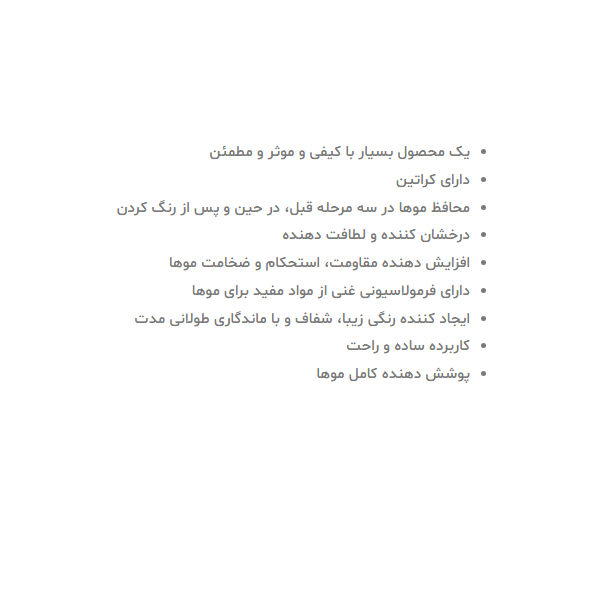 حجم: 48 میلیلیتر طراحی شده برای: بانوان اقلام همراه: کرم رنگ مو: حاوی پروکراتین که در حین رنگ کردن موها را تقویت میکند. شامپو: تثبیت کننده رنگ مو نرمکننده: حاوی سرامید که موها را پس از رنگ کردن بازسازی میکند اکسیدان با سرپوش قیفی دستکش اپلیکاتور |