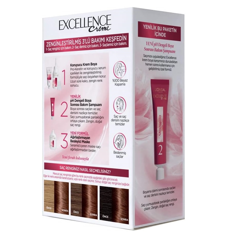 اقلام همراه: 1:دارای اکسیدان با سرپوش قیفی 2:حجم اکسیدان 72 میلی لیتر 3:دارای دستکش 4: اکسیدان با درپوش برس دار 6:سرم محافظت کننده، مناسب استفاده قبل از رنگ کردن 7:نرم کننده حاوی کلاژن مناسب استفاده پس از رنگ کردن،حاوی سرامید که موها را پس از رنگ کردن بازسازی میکند 8:پوشانندگی کامل موهای سفید 9:کرم رنگ مو: حاوی پروکراتین که در حین رنگ کردن موها را تقویت میکند. 10:شامپو: تثبیت کننده رنگ مو 11:اپلیکاتور |