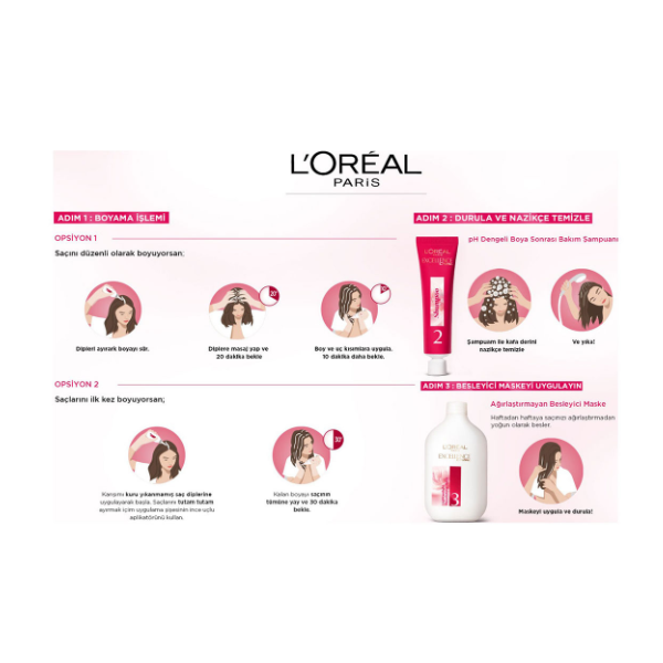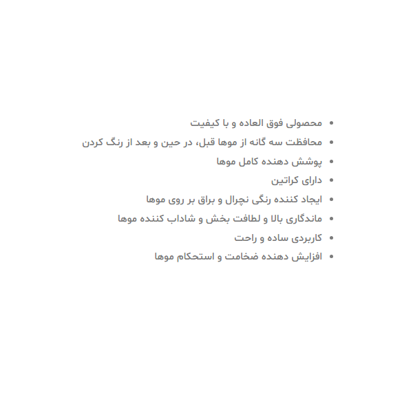 اقلام همراه: کرم رنگ مو: حاوی پروکراتین که در حین رنگ کردن موها را تقویت میکند. شامپو: تثبیت کننده رنگ مو نرمکننده: حاوی سرامید که موها را پس از رنگ کردن بازسازی میکند اکسیدان با سرپوش قیفی دستکش اپلیکاتور |