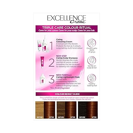 اقلام همراه: کرم رنگ مو: حاوی پروکراتین که در حین رنگ کردن موها را تقویت میکند. شامپو: تثبیت کننده رنگ مو نرمکننده: حاوی سرامید که موها را پس از رنگ کردن بازسازی میکند اکسیدان با سرپوش قیفی دستکش اپلیکاتور |