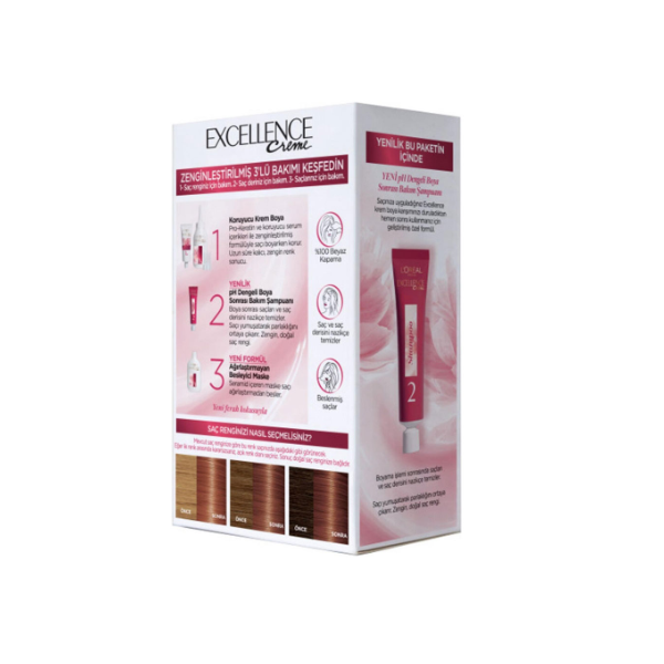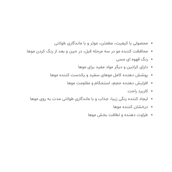 اقلام همراه: کرم رنگ مو: حاوی پروکراتین که در حین رنگ کردن موها را تقویت میکند. شامپو: تثبیت کننده رنگ مو نرمکننده: حاوی سرامید که موها را پس از رنگ کردن بازسازی میکند اکسیدان با سرپوش قیفی دستکش اپلیکاتور |