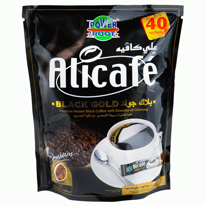 پودر قهوه های علی Ali Cafeکافه در هر بسته 40 ساشه 2.5 گرمی  مطلوب بسیاری از طرفداران قهوه است و توانسته است با بسته بندی منحصر به فرد خود نامی آشنا در صنعت قهوه باشد این ساشه قهوه های بلک گلد علی کافه BLACK GOLD Ali Cafe حاوی قهوه غلیط و تلخی است که در یک فنجان با 170 میلی لیتر آب جوش میبایست مخلوط شود و نوش جان گردد .